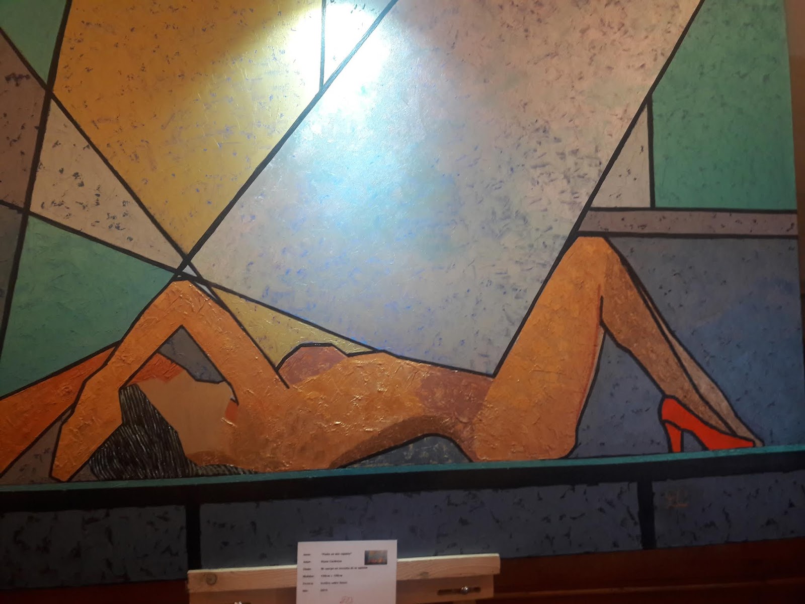 Esta es su primera exposición En Colombia la cual contiene 19 De Arte figurativo mezclado con fondos geométricos. Sus instrumentos para dar formas a cada figuran incluyen el Pincel para enfatizar, la regla para demarcar y la espátula para texturizar. Esta Artista Colombiana mezcla colores Vivo e insospechado con todos metalizados donde predominante el dorado ocre, dado Un mensaje De sofisticación y Belleza además De abundancia universal.